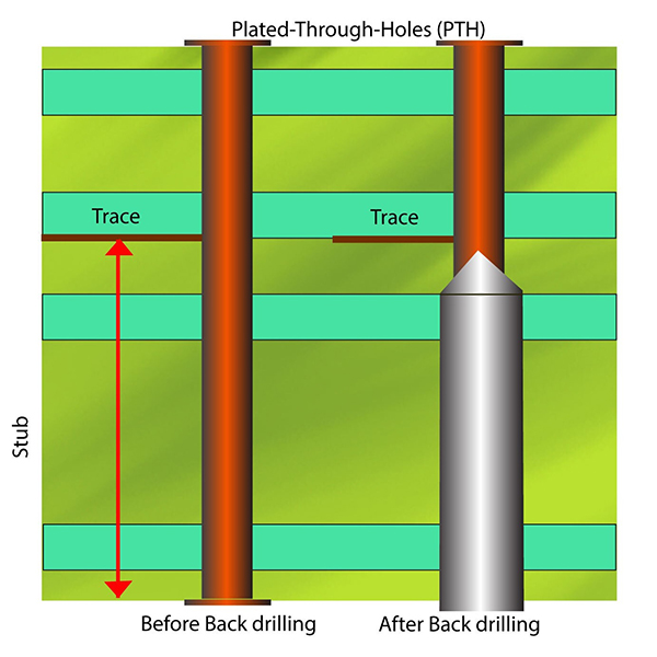 Atpakaļ urbšana iespiedplātnēsir ražošanas process, ko izmanto daudzslāņu PCB. Tā galvenais mērķis ir likvidēt lieko varu caurviju vietās ātrdarbīgu signālu trasēs, tādējādi uzlabojot signāla integritāti un samazinot signāla pārklāšanos un atstarošanos.